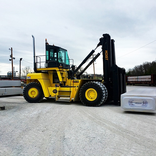 One is that Hoist Liftruck specializes in heavy duty liftrucks that range from 15,000 pounds to 120,000 pounds, in contrast to full line forklift manufacturers whose products typically don’t exceed 20,000 pounds in capacity. These high capacity liftrucks are used in a range of industries, including steel, aluminum, automotive, concrete, forging, lumber, machinery moving and rigging, marina, military, oil and gas, paper, port and intermodal.