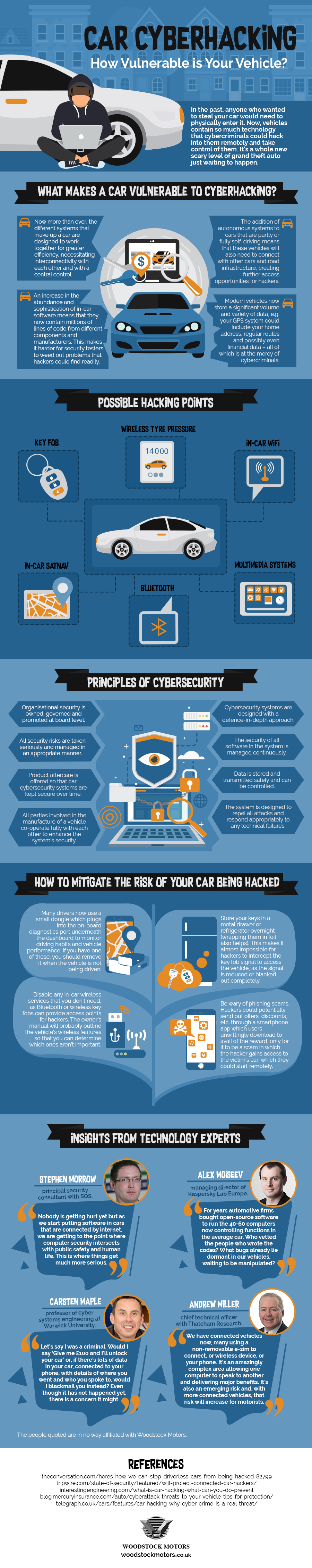 This car cyberhacking infographic outlines how vehicles could be hacked remotely and what you can do to protect your car from cyberhacking.