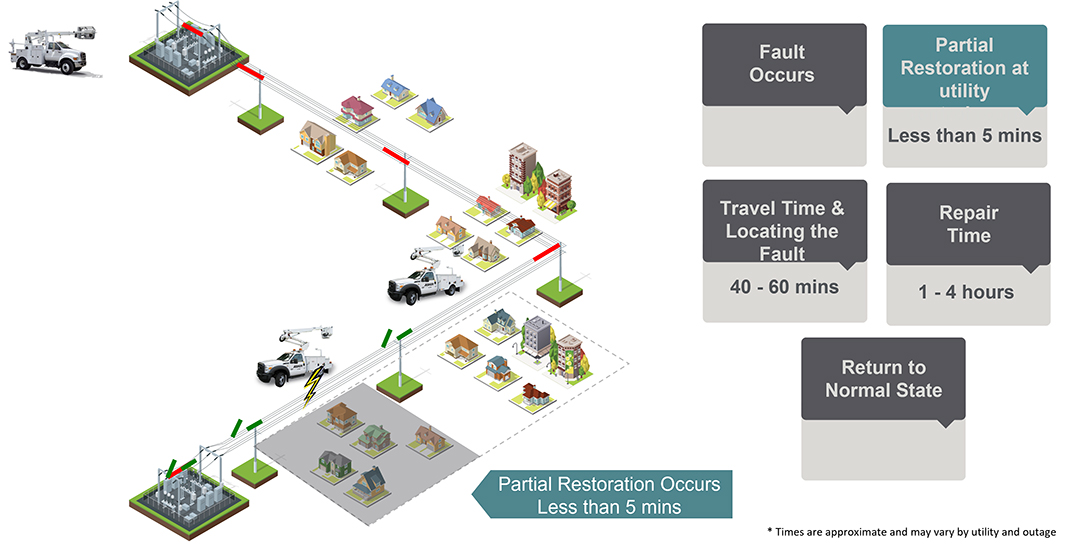 In the last decade, by installing intelligent grid technology like smart reclosers on medium voltage lines, utility companies have reduced the number of customers impacted by outages. Automation capabilities of a recloser enable utilities to have more control over system performance while sectionalizing the grid. For example, if a line goes down during a storm, a recloser can automatically attempt to clear temporary faults and isolate only that section of the grid to protect additional customers from being affected by that fault. Additionally, if the outage requires repairs, reclosers can aid crews in locating the source of the problem to quickly restore power.
