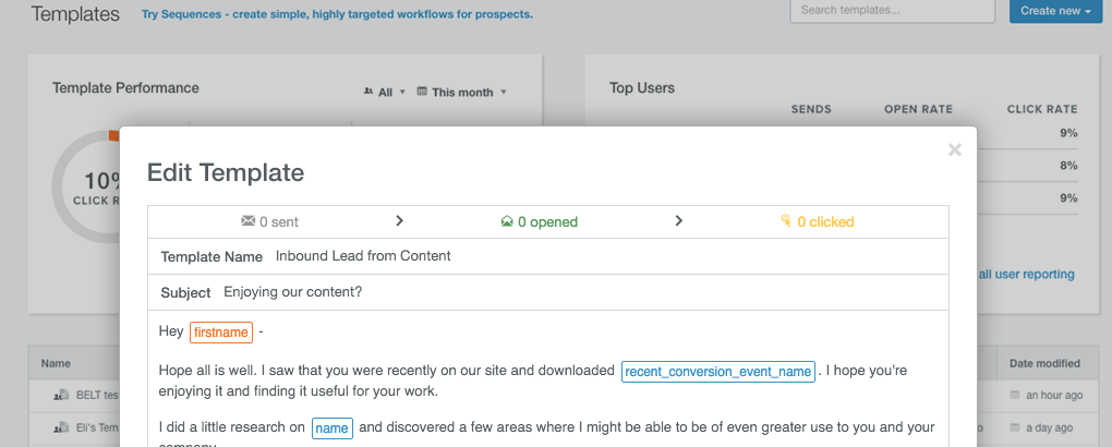 The Sequences tool puts templated emails on steroids. Sequences are email progressions that are triggered by actions taken (or not taken) by a recipient of one of your emails. For example, let’s say your personal sales process includes five initial attempts to connect with a prospect before you call it quits. This software lets you manually write (or template out) those email touch points ahead of time and send them on a schedule you’ve determined for yourself.