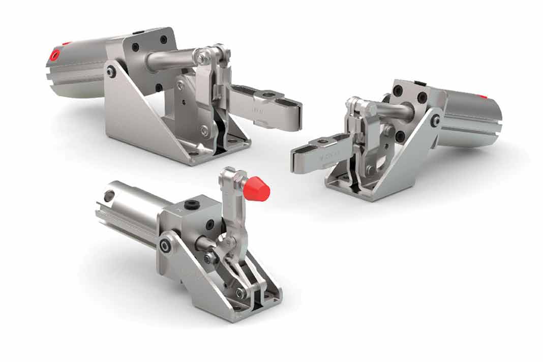 Receiving the most extensive quality enhancements is the Model 802-U Manual Clamp. The updates include an upgraded air cylinder that ensures the clamp’s exerting force is less than the maximum holding capacity when operated at normal pressure, which extends service life; new composite bearings on the trunnion mount and cylinder pivot point that eliminate metal-to-metal contact while requiring no lubrication; and a redesigned clevis bolt, along with increased rivet and pre-stop diameters that increase longevity.