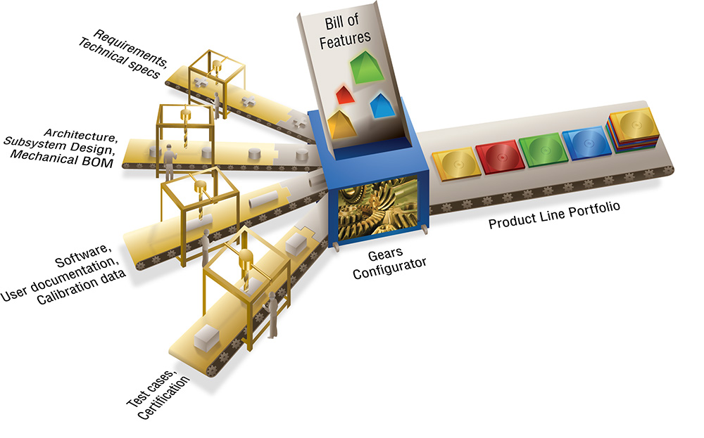A PLE Factory is much like a typical manufacturing factory except that it operates on digital assets rather than physical parts. PLE allows an organization to create a “superset” of shared digital assets that are equipped with all the feature options offered in the product line. The PLE Factory provides an automated production system that assembles and configures these shared digital assets based on the features selected for each product variation.
