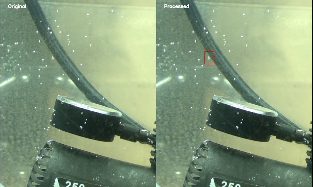 This left side of the video shows traditional leak detection where the product is immersed in the water-filled test chamber and pressurized, and human operators inspect for bubbles. The right side depicts AI-powered and processed bubble immersion leak detection. The system feeds image data into an AI model trained with labeled data, then determines whether there is a defect and outlines the bubble in a red box.