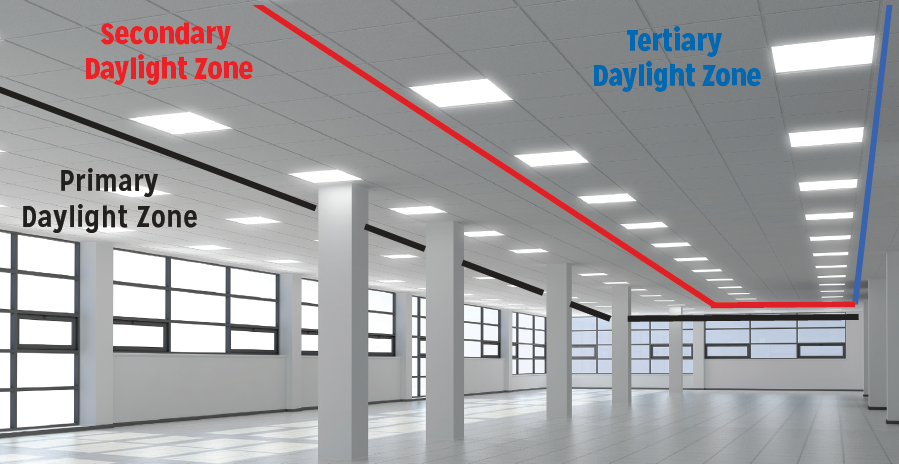 Although controls for dimming fixtures in any remaining area (anything farther inside than the “secondary” zone, an area often referred to as the “tertiary” zone) are not required by codes, certain spaces may still benefit from having all of the remaining fixtures respond to whatever amount of daylight does actually penetrate far enough into the space. This works well for open plan office spaces with no cubicles, a new trend in office design.