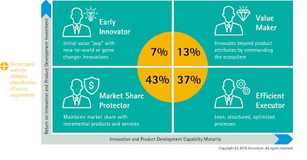 Based on the survey data, Accenture has segmented four distinct categories of innovators: Early Innovator, Value Maker, Market Share Protector and Efficient Executor. All of the leaders fall in either the Early Innovators or Value Makers category.
