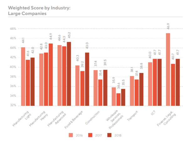 With the global benchmark at 42.1 for small-and-medium-sized businesses and 41.3 for large, companies in both sectors – large, advanced (45.2), small, advanced (43.3), large, heavy (44.9) and small, heavy (44.7) – scored well above average, signaling these firms are at least engaged on sustainability issues.