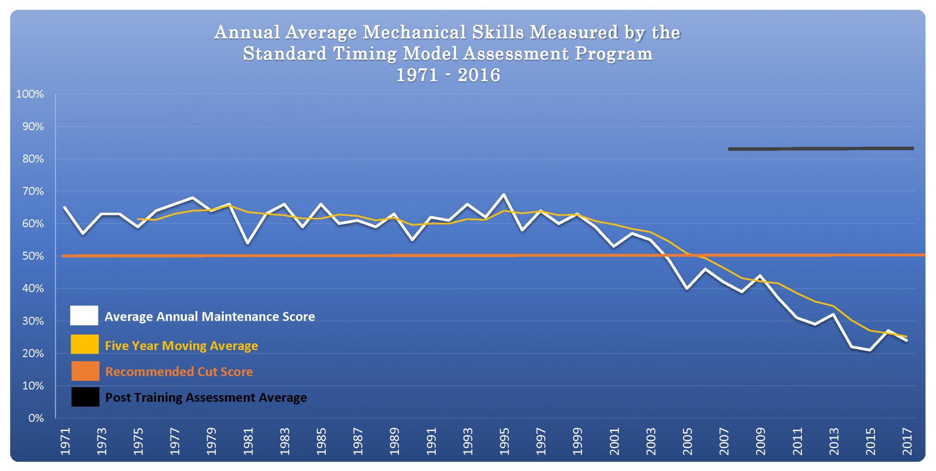 The Manufacturing Skills Shortage problem started slowly primarily due to societal changes regarding the consideration of promising career paths, creeping into the workforce quietly for many years. Our data indicates that the problem started to grow in earnest, impacting performance and profitability, in 1998. For many years assessment scores in the USA were relatively stable. From 1971 to 1997 the average score on our Mechanical Skills assessment program was 61% (a score of 50% or higher identifies strong skills). In 1998 average scores began to decline and that decline has accelerated markedly since then (see chart). Currently, the average score on our mechanical skills assessment is 39%. In the 1980s and early 1990s our typical client would need to administer 10 assessments to identify 5 top performers for hire. Today, as all manufacturers recognize, highly skilled individuals are harder to identify and hire. The current ratio of assessments to hires is approximately 3:1. Given the current state of our manufacturing workforce, that top performer is more valuable than ever before.