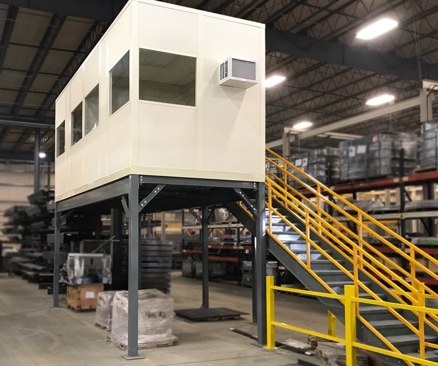 Two 8’ x 20’ mezzanine offices with modular electrical wiring. The mezzanine systems are rated for a uniform live load of 100 PSF and is designed to meet IBC building standards. The mezzanine has a clear height of 8’ underneath, allowing for passage and storage underneath. The offices themselves are composed of our 9’ high vinyl covered gypsum wall panel in champagne.