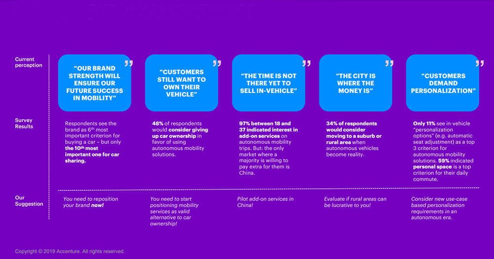 Our research also debunks the myth that the time is not yet here to sell “in-vehicle,” as the vast majority of respondents, especially those under 40, showed interest in add-on services on autonomous mobility trips—such as hotel service, music/movie streaming, catering, wellness (massage seat), etc.