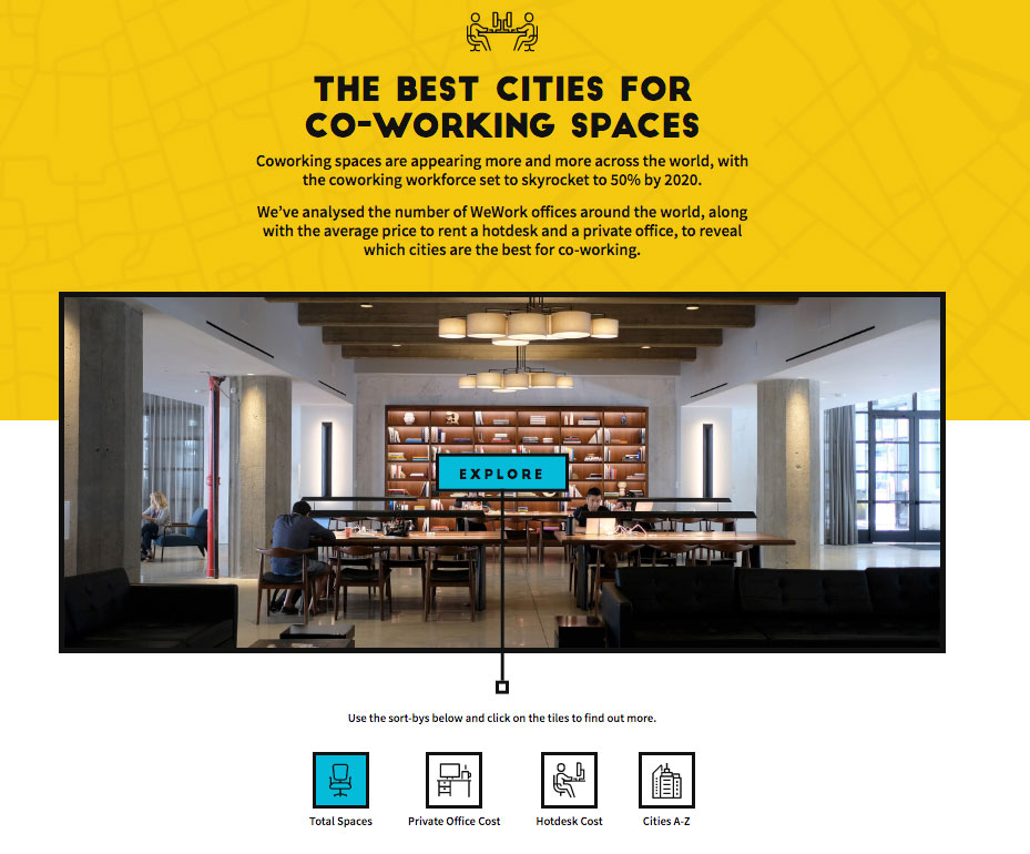 It is thought that the co-working workforce is set to skyrocket to 50% by 2020, with more co-working spaces appearing every month. Liberty Games have analysed the number of WeWork offices around the world, along with the average price to rent a hotdesk and a private office, to reveal which cities are the best for co-working. You can view the interactive index here.