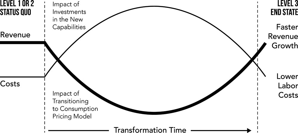 One such challenge is the initial revenue impact, referred to as the “swallowing the fish” effect. In the early stages of a business transformation as a company begins to shift its revenue mix, we often see the revenue curve temporarily dip below the operating expense curve before climbing back upward again. Marked by higher costs and lower revenue, it’s a short-term reality as organizations shift focus from maximizing products sold, to fostering long-term relationships with customers, and can vary based on industry.