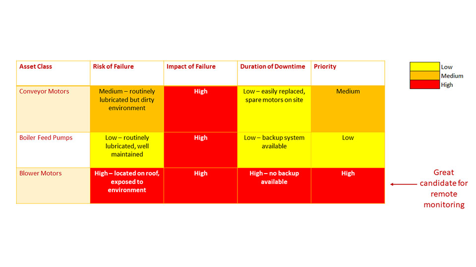 Once you’ve tabulated these three factors, prioritize assets to determine their suitability for inclusion in a remote condition monitoring program (see table). A well-maintained boiler feed pump might have a low priority ranking despite high impact of failure because it can be easily switched to a backup system. In contrast, a rooftop blower motor might be classed as high risk because of its location, environmental conditions, and lack of backup system.