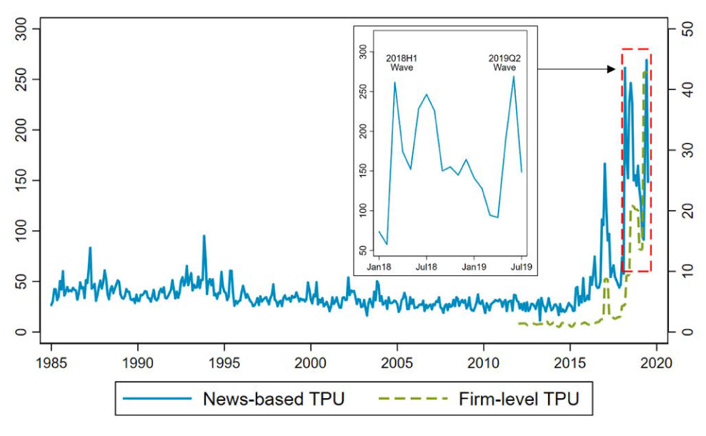 To make their point, they created and use two measures of uncertainty. The first “is based on searches of newspaper articles that discuss trade policy uncertainty.” The publications comprising this database were “Boston Globe, Chicago Tribune, Guardian, Los Angeles Times, New York Times, Wall Street Journal, and Washington Post.” The second was constructed “in an analogous way from automated text searches of the quarterly earnings call transcripts of U.S.-listed corporations.”