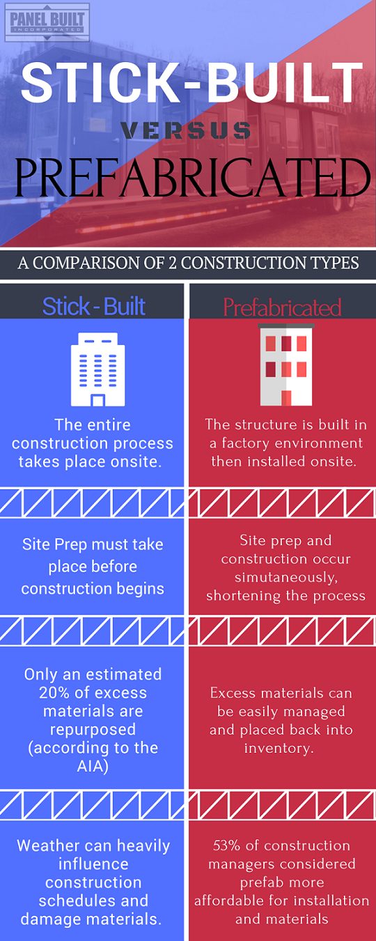 A side-by-side comparison of the differences between stick-built and prefabricated construction types.