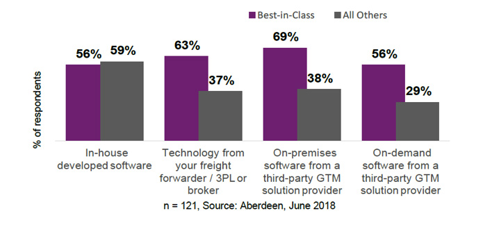 Best-in-class companies, however, are embracing GTM solutions. Despite a fairly high level of in-house developed systems remaining in place, more than 81% of best-in-class companies surveyed by Aberdeen indicate they are more likely to adopt a best-of-breed GTM solution, either cloud-based or on-premises. Over 71% are more likely to leverage technology from logistics partners.