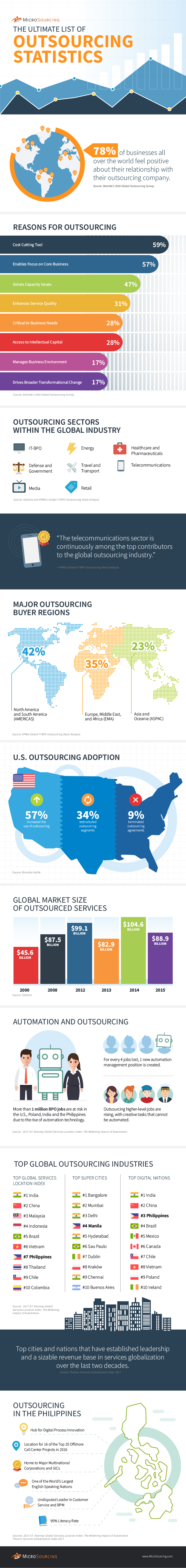 This infographic shows an ultimate list of outsourcing statistics to help stay up-to-date with the trends and learn about the global outsourcing industry.