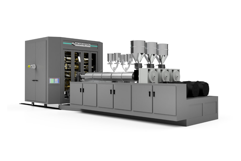 Rotary Blow molding is the fastest way to produce high quality bottles in an all-electric machine. With processing speeds of 1200 bottles per minute including multi-layer applications. Wilmington’s Rotary Blow Molders can run single, dual, or even triple parison. With a Wilmington wheel you can run 2-3 bottles from the same machine without changing molds.